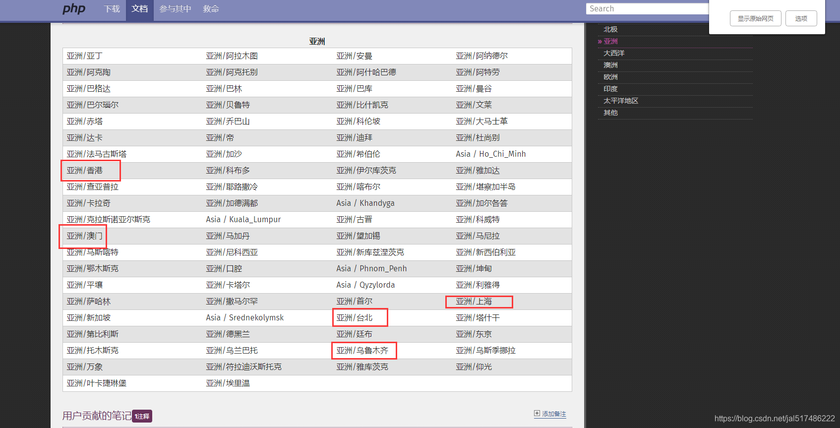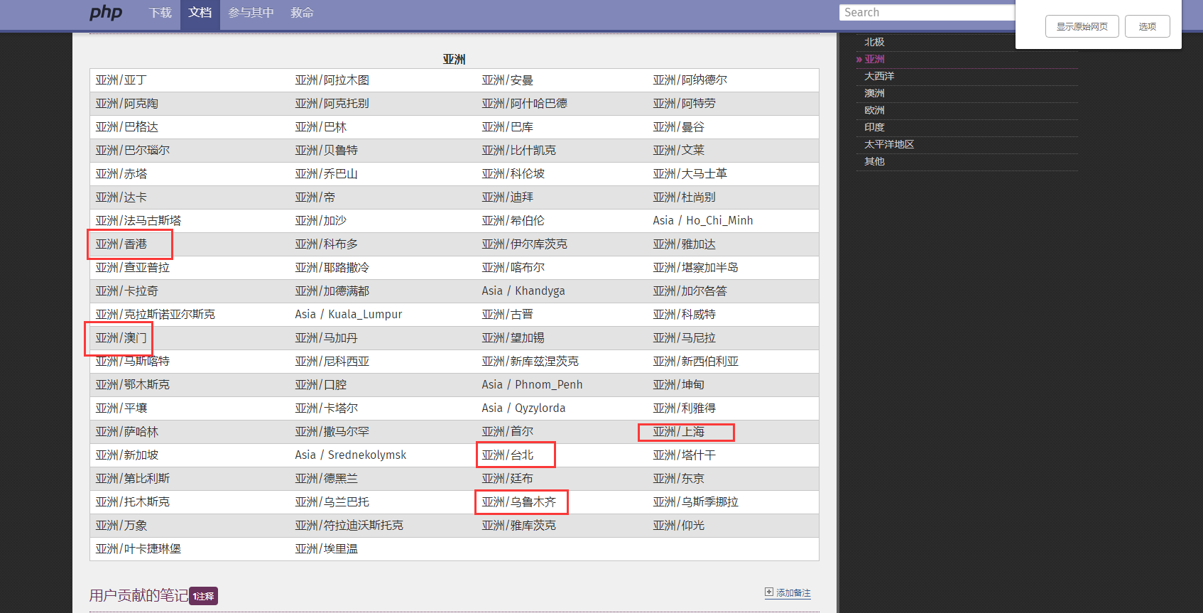 http://php.net/manual/zh/timezones.asia.php 这个链接就是截图的网页,我所展示的是亚洲的时区,如果对英语不熟可以用谷歌翻译