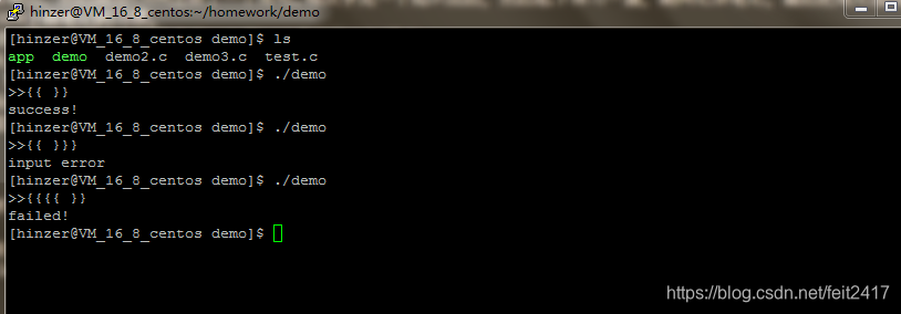 思路:在while循环条件中读取我输入的字符,只有当输入缓冲区没有数据或者我这里产生回车符'\n'时,才会判断条件不成立。counter这个变量用来标记'{ }'是否成对出现(当有'{'读入时,counter++,当有'}'读入时,counter--)。另外,'}'为了和前面的'{'完成配对,和最前面未配对的'{'相互匹配,这时候counter不可能是负数。最后当用户输入结束时(按下回车键),程序也根据counter是否为0,来判断花括号是否成对出现了。