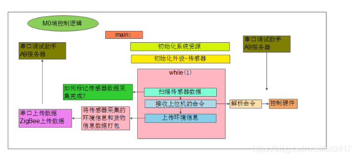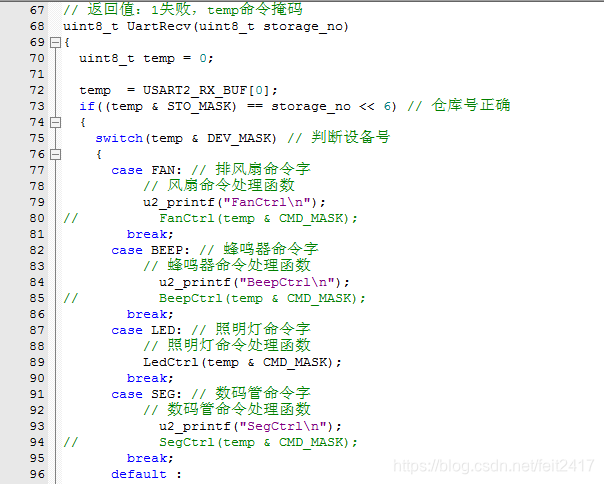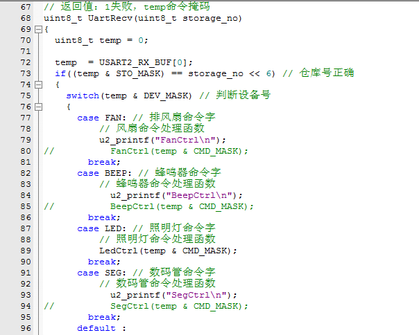 对输出设备硬件初始化,然后在while循环中轮询串口2中断标志位。当接收到数据后,进行数据分析处理。