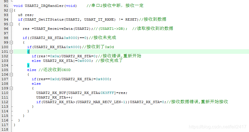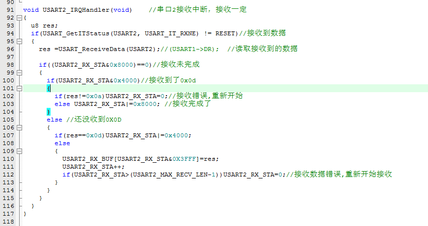 这里是串口2中断程序的实现,当接收到的数据流最后两个字节是 0a 0b(win系统下的回车换行符),节判断为接收完成了。数据存放在USART2_RX_BUF数组中,USART2_RX_STA是状态标记。