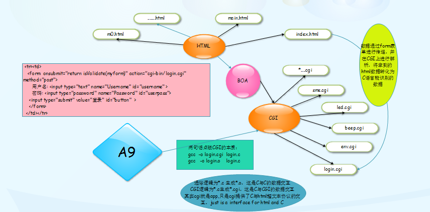 用户通过客户端应用(浏览器)向web服务发送一个get请求,web服务器返回一个默认的静态html页面;用户想在这个基础上进一步操作,比如用户登录,需要填写 '用户名-密码' 吧,这样提交的信息就以form表单的形式从web服务器,再通过CGI接口向服务器上的应用发送。CGI就是这么一个中间机制,这里简单理解就是讲前端产生的html语言转换成应用层的c语言,实现交互。