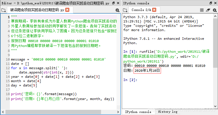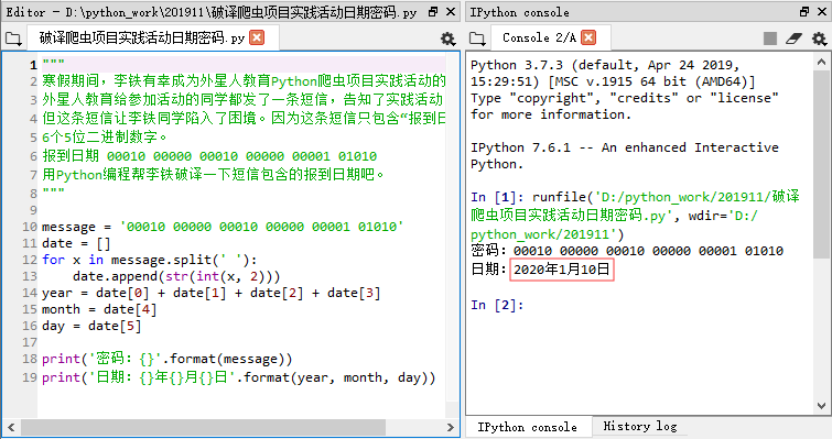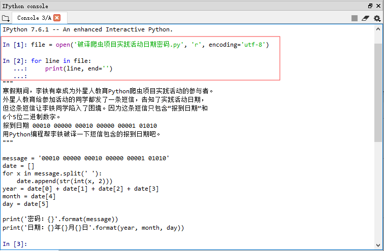 寒假期间,李铁有幸成为外星人教育Python爬虫项目实践活动的参与者。外星人教育给参加活动的同学都发了一条短信,告知了实践活动日期,但这条短信让李铁同学陷入了困境。因为这条短信只包含“报到日期”和6个5位二进制数字。