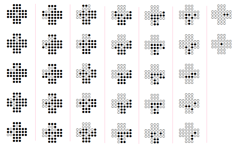 #include<iostream> using namespace std; int list[7][7]; void display() { for (int i = 0; i < 7; i++) { for (int j = 0; j < 7; j++) { if (i == 2 || i == 3 || i == 4 || j == 2 || j == 3 || j == 4) { if (list[i][j] == 2)cout << "●"; else cout << "〇"; } else cout << " "; } cout << endl; } cout << endl << endl << endl; } void up(int i, int j) { list[i - 1][j] ++; list[i][j] --; list[i + 1][j] --; display(); } void down( int i, int j) { list[i + 1][j] ++; list[i][j] --; list[i - 1][j] --; display(); } void left(int i, int j) { list[i][j - 1] ++; list[i][j] --; list[i][j + 1] --; display(); } void right(int i, int j) { list[i][j + 1] ++; list[i][j] --; list[i][j - 1] --; display(); } int main() { for (int i = 0; i < 7; i++)for (int j = 0; j < 7; j++) { list[i][j] = 0; if (i == 2 || i == 3 || i == 4 || j == 2 || j == 3 || j == 4)list[i][j] = 2; } list[3][3] = 1; display(); down(2, 3); right(2, 2); up(3, 2); right(4, 1); down(2, 2); down(3, 0); left(4, 2); right(4, 1); left(2, 3); down(1, 4); right(0, 3); up(2, 4); down(1, 4); left(2, 4); left(2, 2); down(3, 1); right(4, 2); up(5, 2); up(4, 4); left(4, 5); down(3, 6); right(4, 4); left(4, 5); down(4, 4); up(5, 4); right(3, 3); up(5, 3); down(4, 4); right(4, 3); up(4, 4); left(3, 4); system("pause>nul"); return 0; }