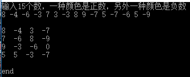 #include<iostream> using namespace std; bool change(int list[16], int position) { if (position > 15) { if (list[12] + list[13] + list[14] + list[15] != 0)return false; for (int i = 0; i < 16; i++) { if (i % 4 == 0)cout << endl; cout << list[i] << " "; } return true; } if (position > 11 && list[8] + list[9] + list[10] + list[11] != 0)return false; if (position > 7 && list[4] + list[5] + list[6] + list[7] != 0)return false; if (position > 3 && list[0] + list[1] + list[2] + list[3] != 0)return false; for (int i = position; i < 16; i++) { int temp = list[i]; list[i] = list[position]; list[position] = temp; if (change(list, position + 1))return true; list[position] = list[i]; list[i] = temp; } return false; } int main() { int list[16]; cout << "输入15个数,一种颜色是正数,另外一种颜色是负数" << endl; for (int i = 0; i < 15; i++)cin >> list[i]; list[15] = 0; change(list, 0); cout << endl << endl << "end"; system("pause>nul"); return 0; }