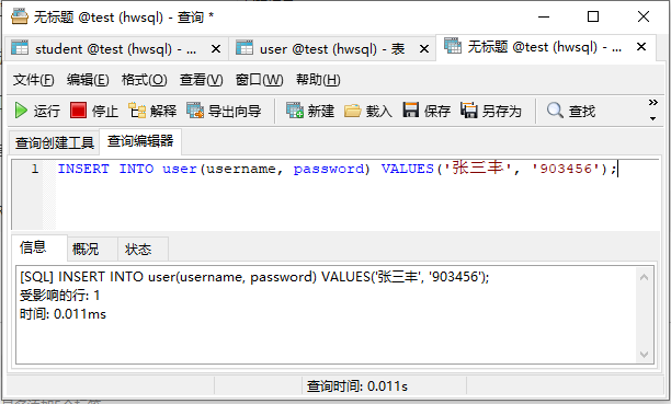 INSERT INTO user(username, password) VALUES('张三丰', '903456');