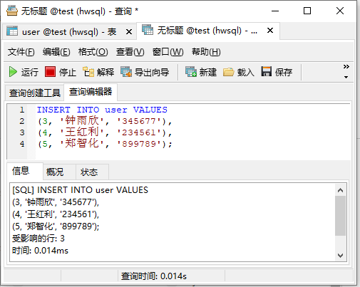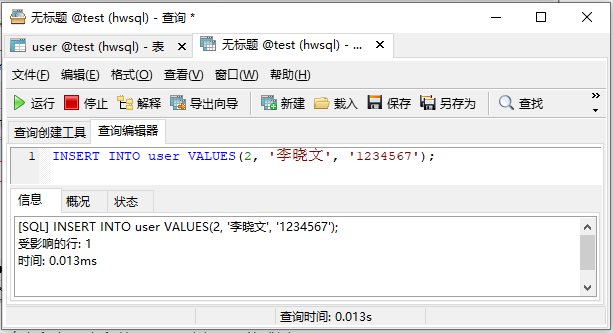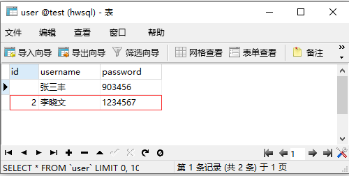 INSERT INTO user VALUES(2, '李晓文', '1234567');