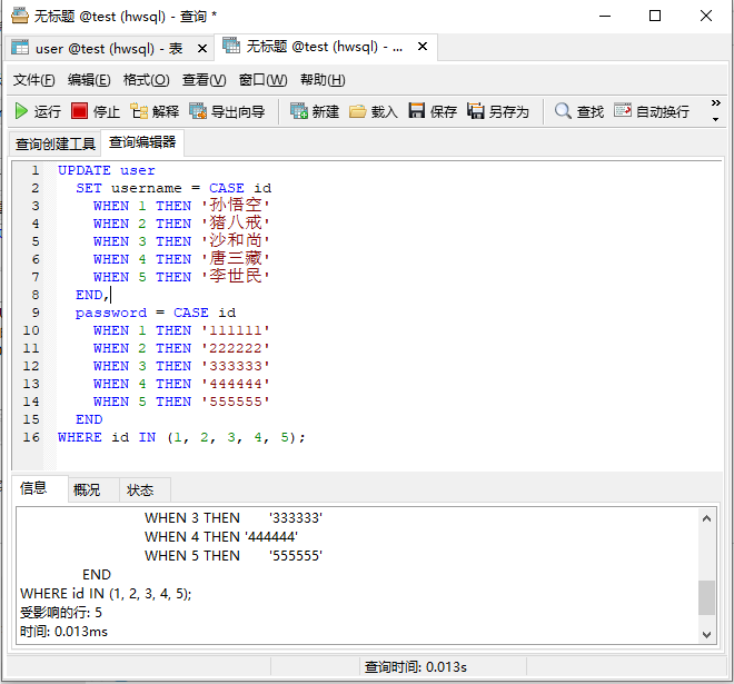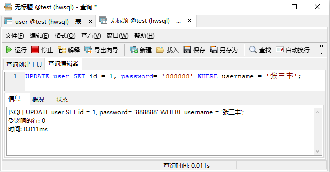 UPDATE user SET id = 1, password= '888888' WHERE username = '张三丰';