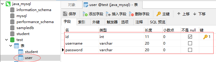 在test数据库里创建user表: