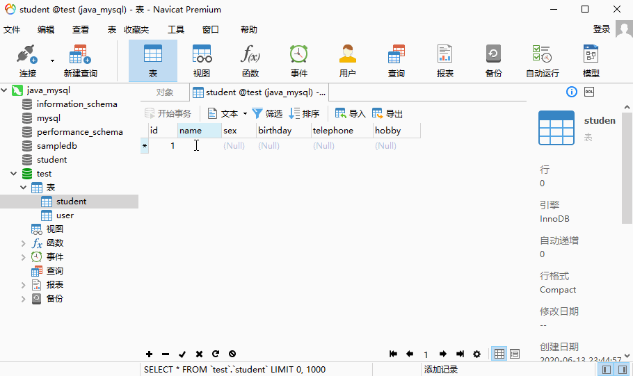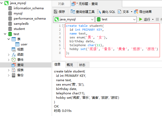 在数据库test里创建student表: