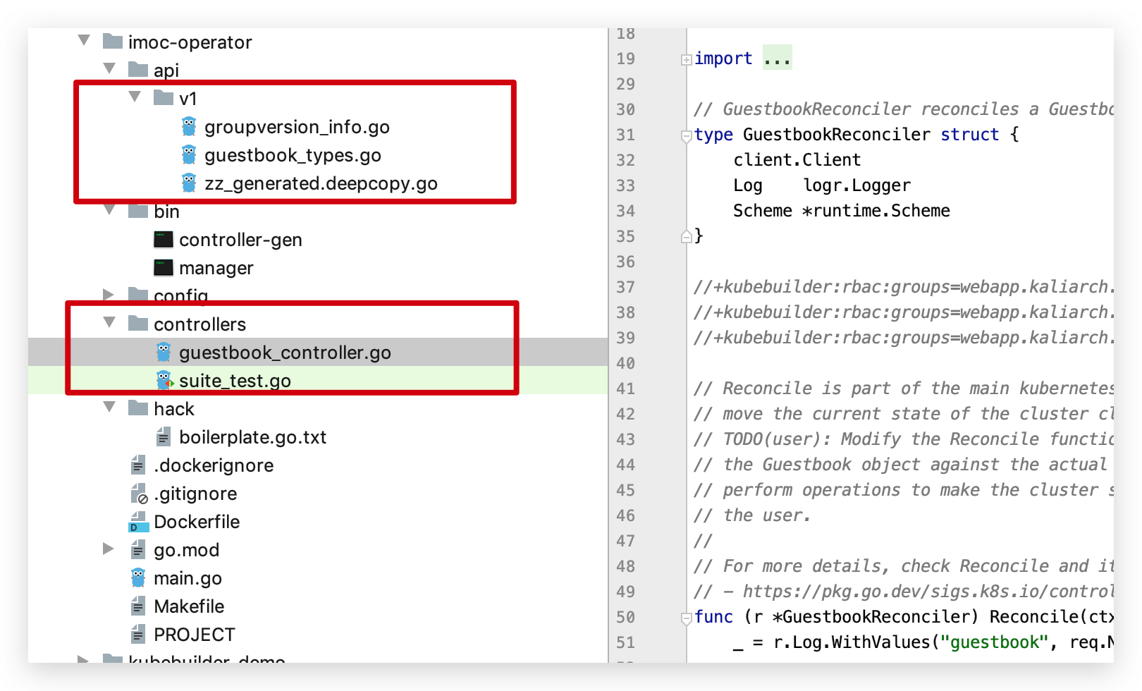 如果你在 Create Resource [y/n] 和 Create Controller [y/n] 中按y,那么这将创建文件 api/v1/guestbook_types.go ,该文件中定义相关 API ,而针对于这一类型 (CRD) 的对账业务逻辑生成在 controller/guestbook_controller.go 文件中。