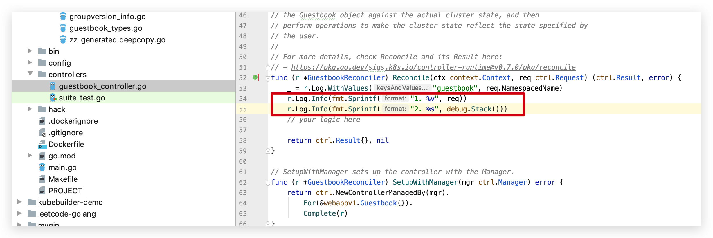 Kubebuidler 为我们生成的脚手架文件,我们只需要实现 Reconcile 方法即可。