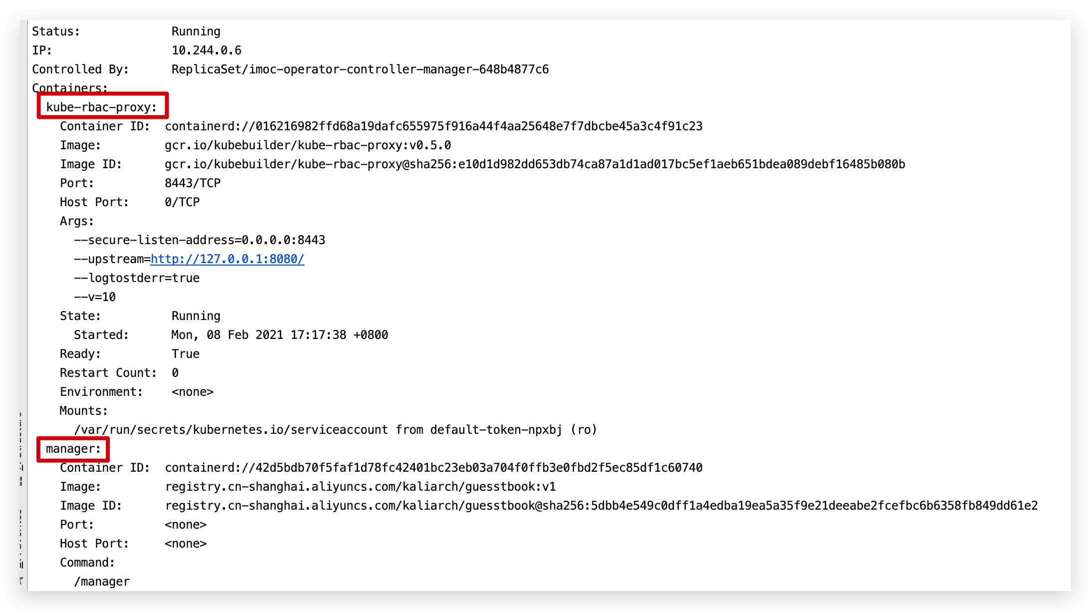 显示这个pod实际上有两个容器,用kubectl describe命令细看,分别是kube-rbac-proxy和manager -