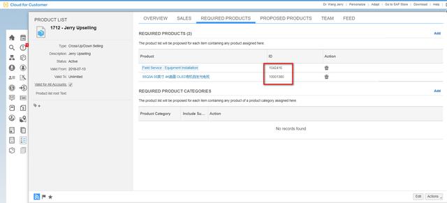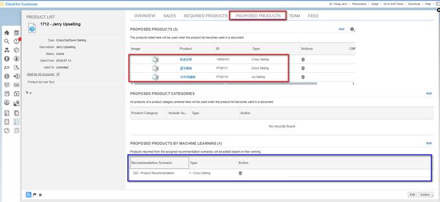 有了人工智能加上机器学习后,就可以省去这些人工配置的步骤和工作量。我给这个Product List加上了一个"203 - Product Recommendation"的场景,如下图蓝色区域所示,希望让这个Product List里包含的产品被加入到销售订单时,通过人工智能的方式由SAP C4C系统自动推荐相关产品给我。