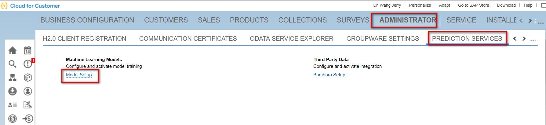 下面我们一起来看看人工智能在产品推荐这个场景里的具体实现吧。还是先去Administrator->Prediction Services,点击Model Setup进行机器学习的模型设置。