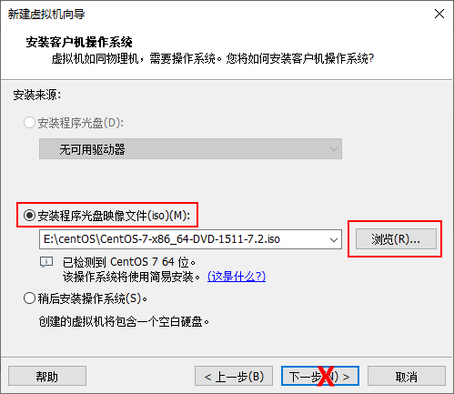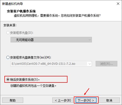 这一步是选择我们下载的操作系统镜像文件,选择之后不要点击下一步,选择稍后安装操作系统。