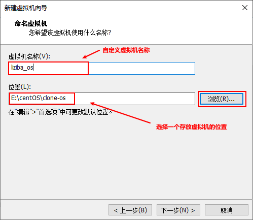 这一步做两个事情,第一个是给你的虚拟机命名,第二个是选择虚拟机的存放地址(建议修改盘符,默认是C盘的某个安装地址),均是为了方便管理和区分