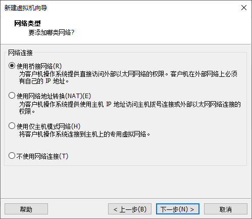 网络类型有四种类型,分别是桥接、NAT、仅主机、不使用网络连接,这几者的简单区别如下: