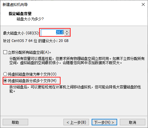 指定磁盘的最大磁盘大小(根据自己需求和配置来选择),选择将虚拟磁盘拆分成多个文件,单击下一步
