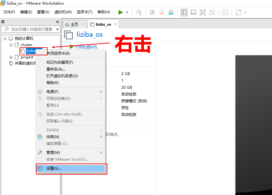 在我的计算机中选择刚刚创建好的虚拟机,右击选择设置