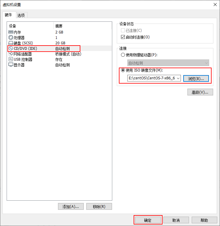 选择CD/DVD(IDE),我们将默认的自动检查,修改为使用ISO映像文件,选择我们下载的镜像文件(上面安装虚拟机使用的镜像文件),单击确定