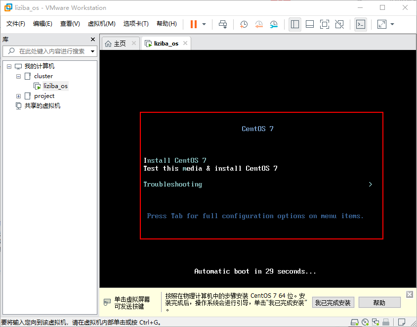 这里出现了三个选择,我们选择Install CentOS 7(第一个),然后键入Enter(回车),等待系统初始化。这里需要注意一下,如果你的鼠标不见了,不要急,使用Ctrl + Alt即可释放。
