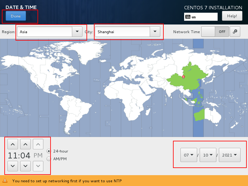 选择Asia 亚洲, shanghai 上海,对应的时间和日期我们可以手动修改,时间可以选择24小时制和AM/PM格式的,选择修正后单击Done