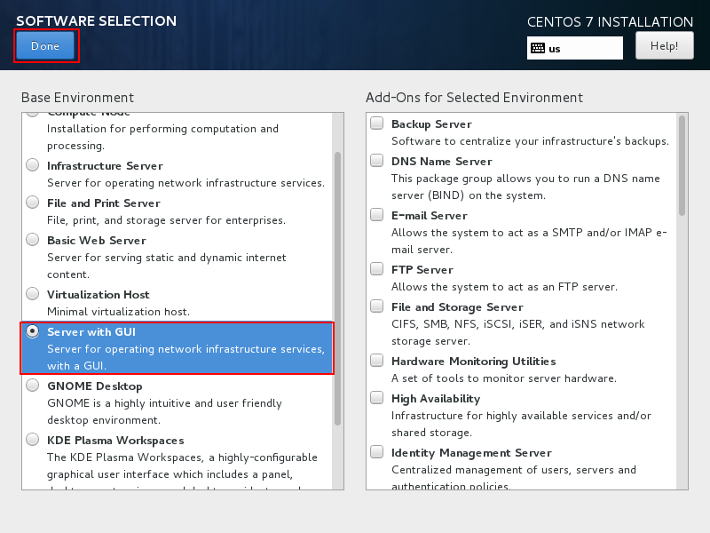 为了操作方便可以选择Server with GUI,选择完成后单击Done