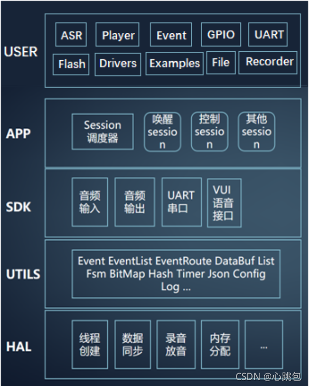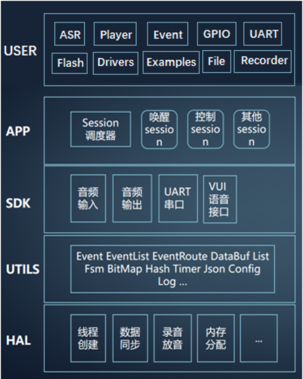 - SDK层:提供核心功能接口,如:Audio Play、MP3 解码、语音识别等;