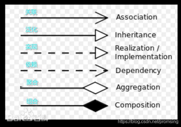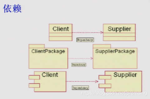 实现:类与接口、子系统与接口、组件与接口、用例与接口等,类元之间的语义关系