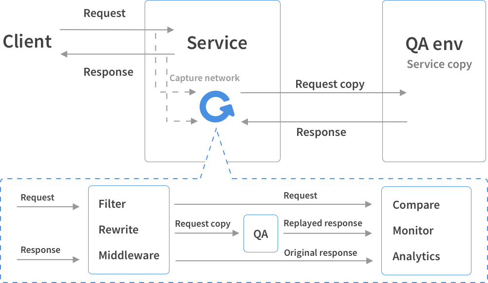 - GoReplay 不是代理,而是监听网络接口上的流量,不需要更改生产基础架构,而是在与服务相同的计算机上运行 GoReplay 守护程序。