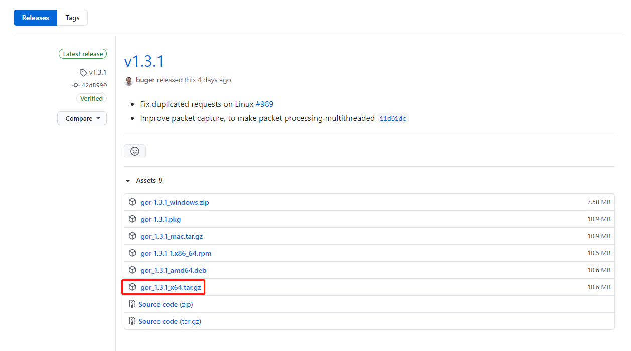 从https://github.com/buger/gor/releases 下载最新的 Gor 二进制文件(提供 Windows、Linux x64 和 Mac OS 的预编译二进制文件),也可以自己编译 。