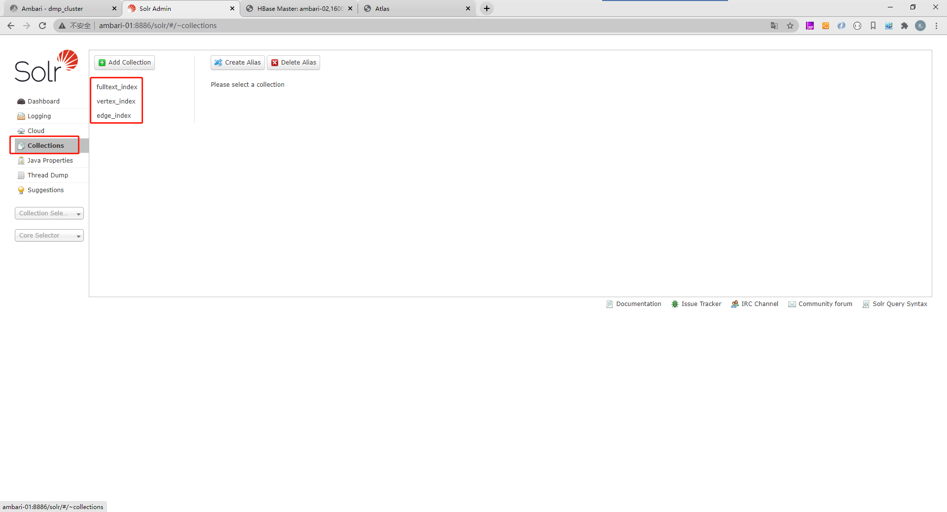 Atlas除了把元数据存储在HBase,为了实现快速检索,还会把元数据对应的索引存储在Solr中,我们登录Solr应该可以看到三个集合已经创建好: