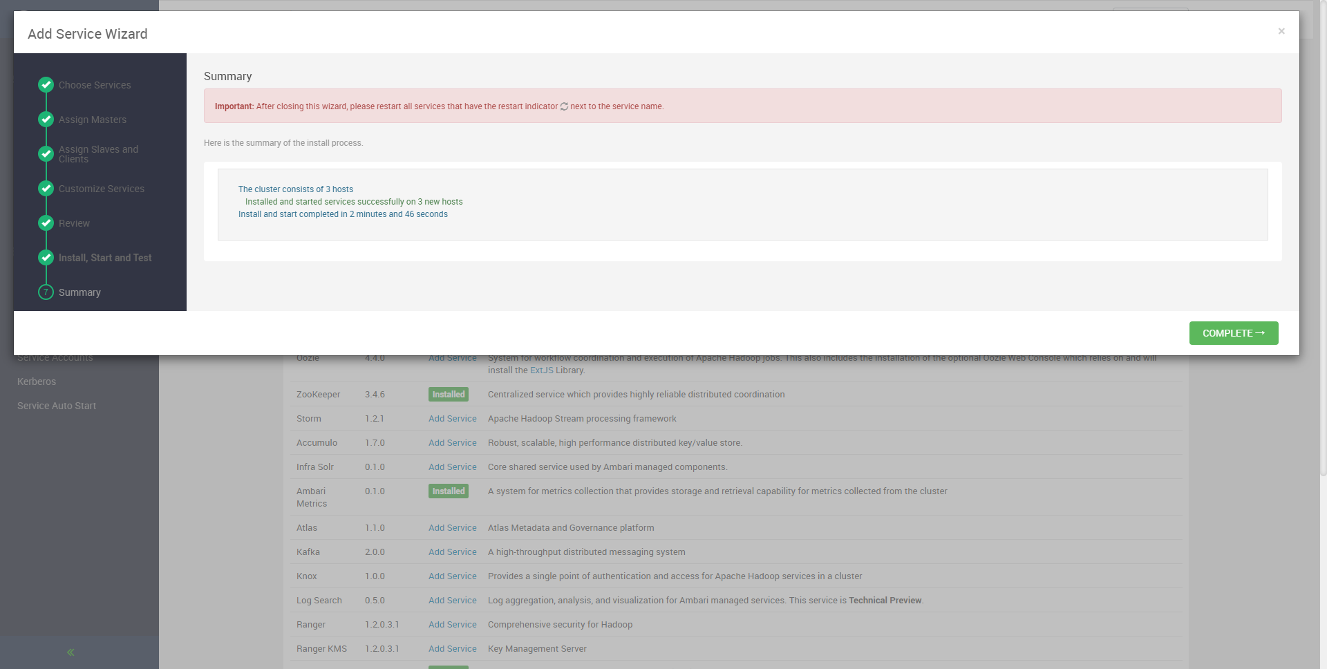 Important: After closing this wizard, please restart all services that have the restart indicator next to the service name.