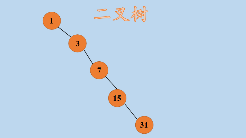 在上图中,-1 表示该结点为空(图中淡黄色部分),很明显,使用顺序存储结构后,有三个数组元素是空的,假设是一棵更大的单支二叉树,比如下面这种: