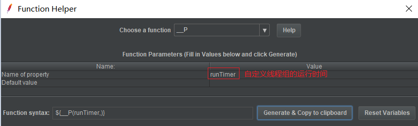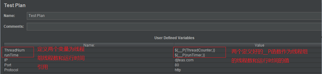 1、在Testplan测试计划的用户自定义变量中的Name定义线程组中的线程和运行时间变量,在Value中引用__P函数变量名称。