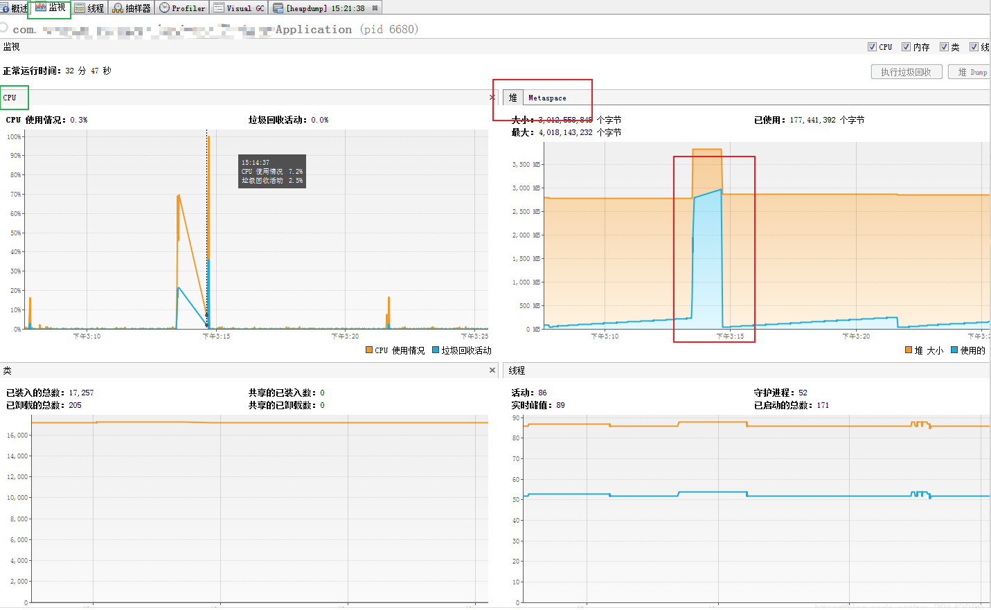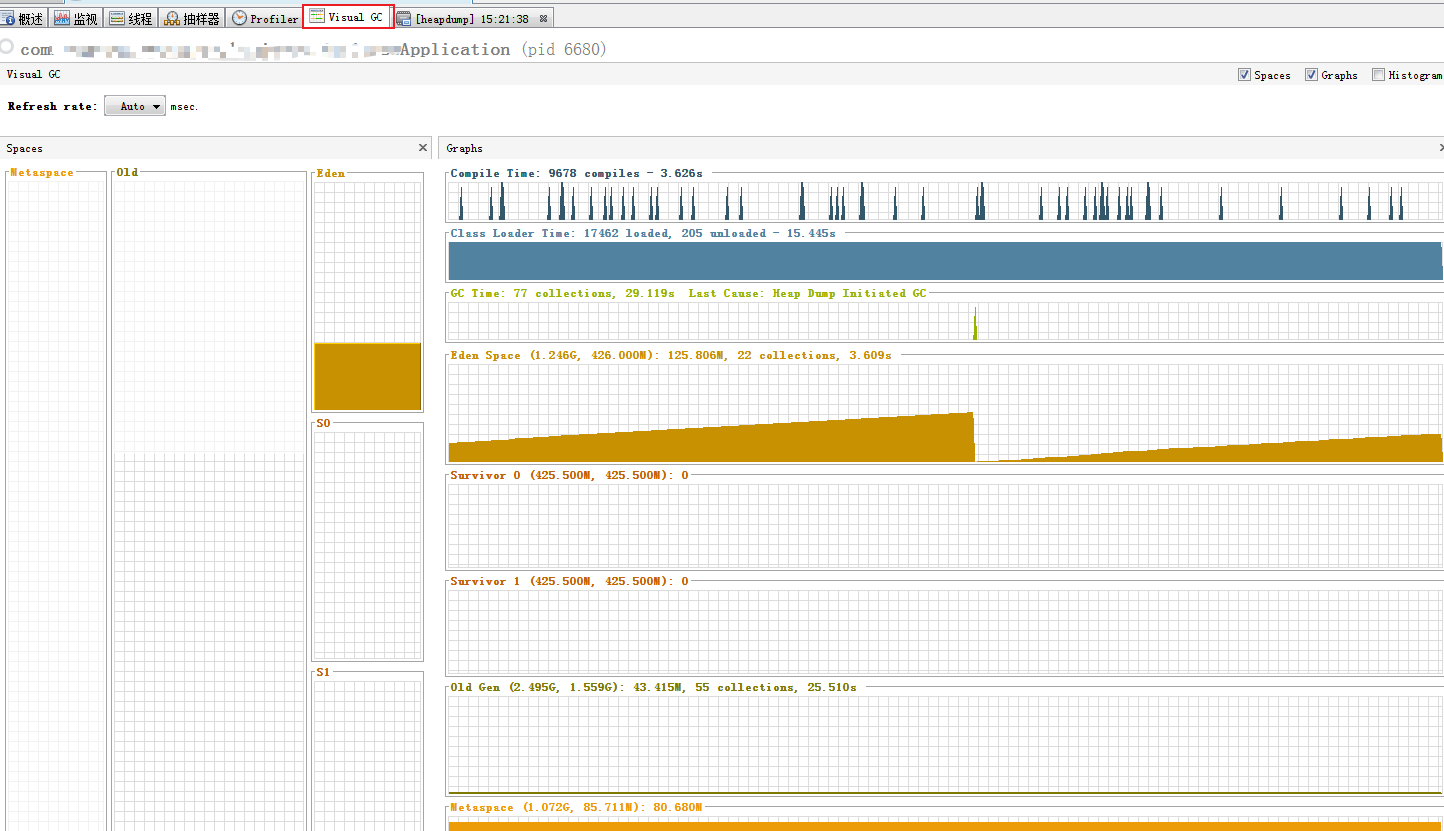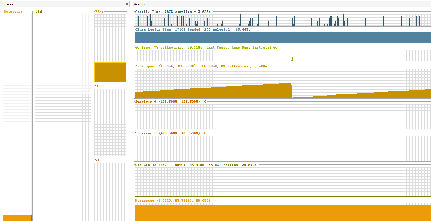 通过下图就可以看到jvm情况,可以明显分析出在堆中红框发生了内存溢出。