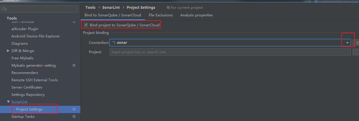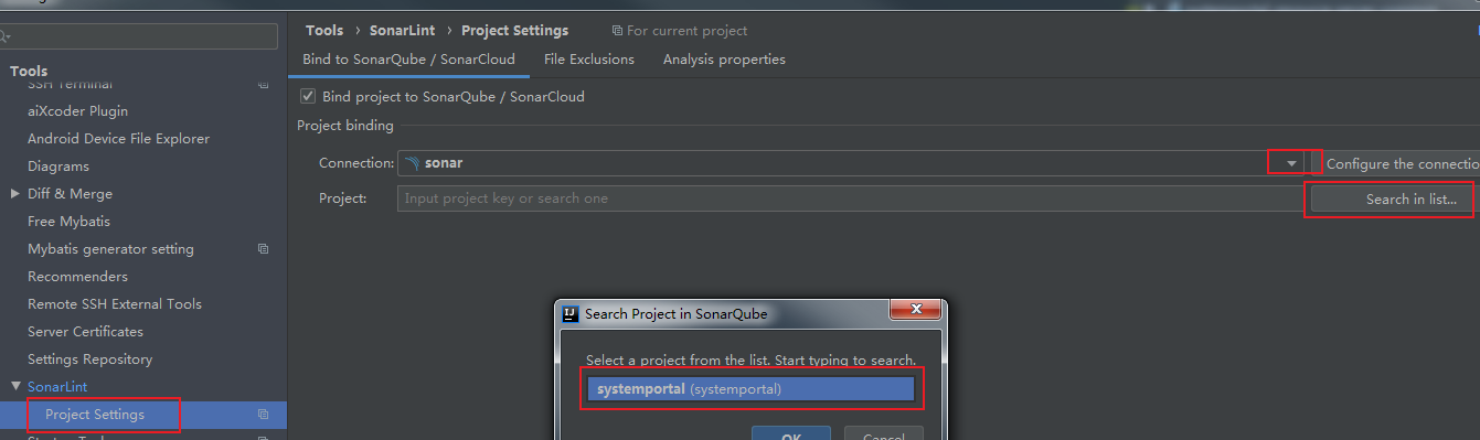 执行完命令后回到SonarLint Project Settings,点击search in list 选择项目。