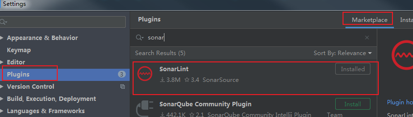 打开File->Settings->Plugins,搜索SonarLint插件,点击安装。安装后重启idea,如果安装失败,在网上下载插件,丢到idea安装目录的plugins文件夹中。