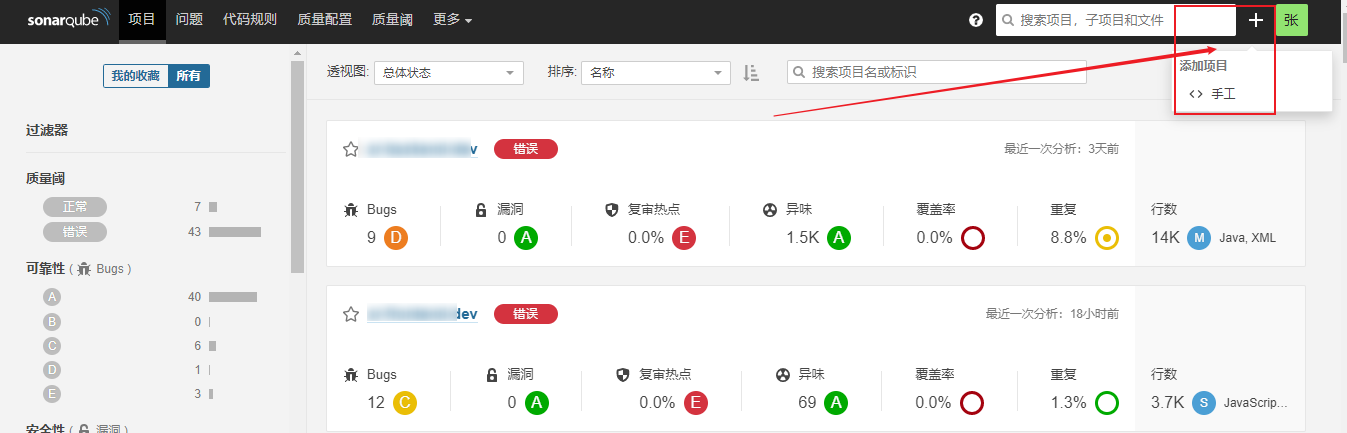 1.登录安装好的SonarQube地址,点击加号+,手工