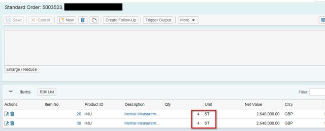 比如我在ID为IMU的产品主数据里维护了1个ST的单位重50KG,那么下图订单包含了两个行项目,一共8个ST,毛重50 × 8 = 400KG。