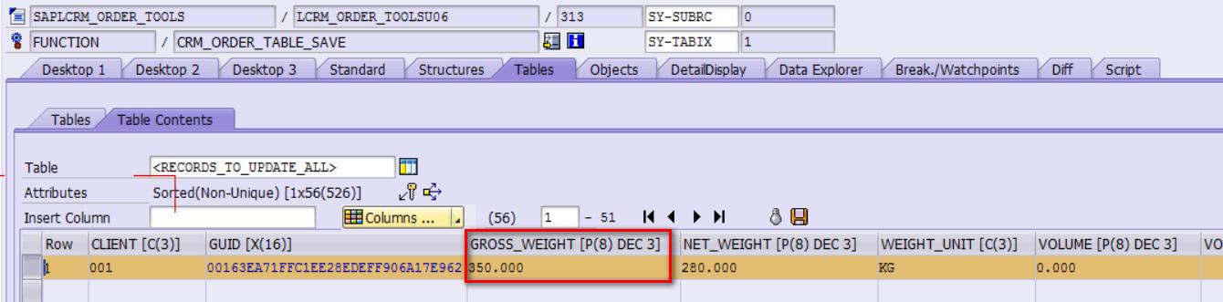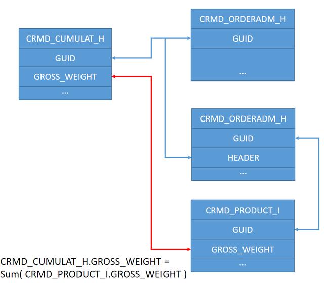 顾名思义,这个字段的值是从另一张存放行项目明细信息的表CRMD_PRODUCT_I里的GROSS_WEIGHT累加而来的,这也是这张表的部分名称CUMULAT的由来:(cumulate累积)