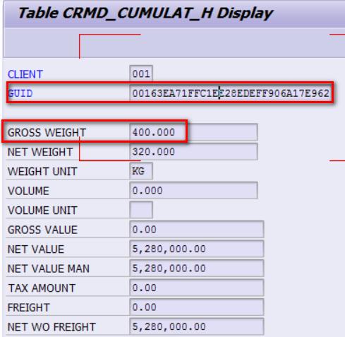 这个400KG是存储在表CRMD_CUMULAT_H的GROSS_WEIGHT字段。