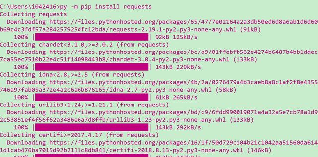 Python安装完毕之后,即可使用命令行py -m pip install requests安装Python的包管理器pip。