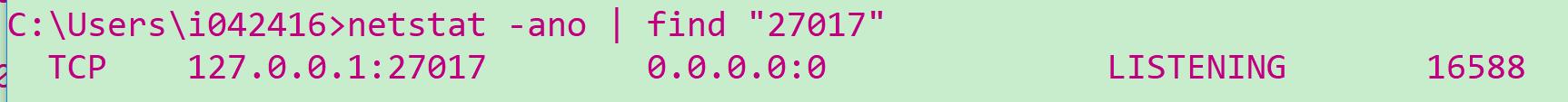 在cmd里用命令netstat -ano | find “27017”, 发现确实进程id为16588的进程在端口27017监听: