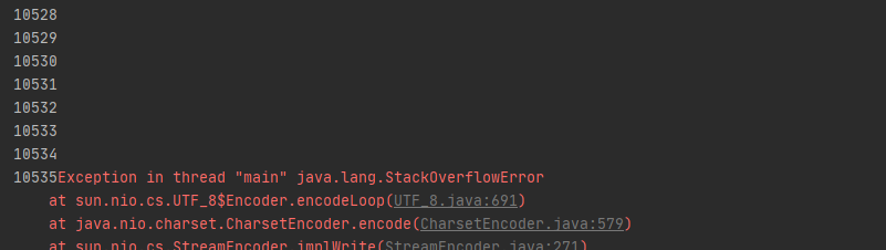 多次执行结果均接近于10535,可以推导出:每个线程的栈的大小是固定的,每次方法调用时就会往栈里面存入东西,在无限递归的场景下,一直存一直存就出现了内存溢出的情况。