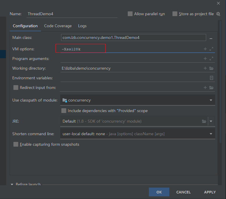 为了验证每个线程分配的的栈内存的大小是固定的,我们可以通过修改VM options -Xss参数,设置每个线程分配的的栈内存的大小为128k(注意这个值不能太小,否则虚拟机启动就会抛出异常)