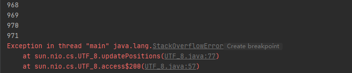 将线程分配的的栈内存空间调小之后,再次执行上述代码,发现程序大概执行了970次左右就会抛出StackOverflowError异常,这样就确信栈的线程分配的的栈内存空间大小是一个固定值了。