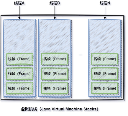 虚拟机栈是线程私有的内存区域。虚拟机栈的内存空间是给线程使用的,每个线程启动后,虚拟机为其分配一块栈内存空间,虚拟机栈中存在多个栈帧。