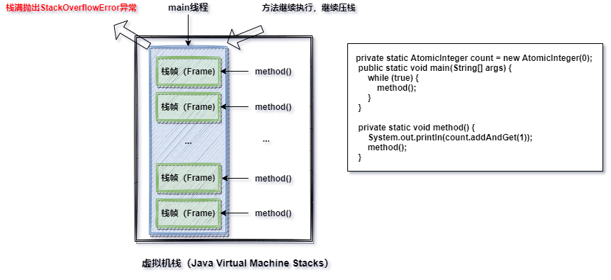 每个线程分配的栈内存空间就好比一根用来串珠子的绳子,绳子的长度是固定的,并且只能从穿入的那一端出入,珠子就好比线程运行过程中需要执行的方法,珠子有大有小,就好比方法因为其局部变量等原因,内存大小不一。每当调用一个方法,就需要穿入一颗珠子,方法执行完毕,珠子就会取出来。而上述例子发生StackOverflowError异常的原因,就是方法一直在循环调用没有返回,导致线程的分配的栈内存达到上限抛出了StackOverflowError异常。