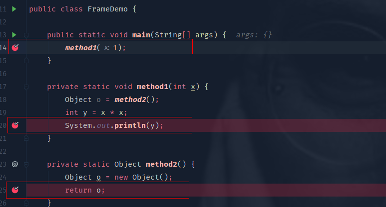 IDEA是主流的Java代码编写工具,学会如何在IDEA中DEBUG栈帧,是一项必备的小技能。(其实我相信大部分人都会用,但是它们并不一定知道这就是栈帧);简单的示例代码如下所示: